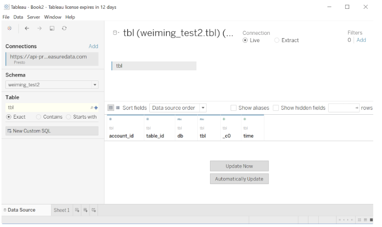 Enter a Schema (database name) and Table (table name) to import data from a table, or to write SQL that imports data from multiple tables. Select Update Now to see the data in the Tableau window.