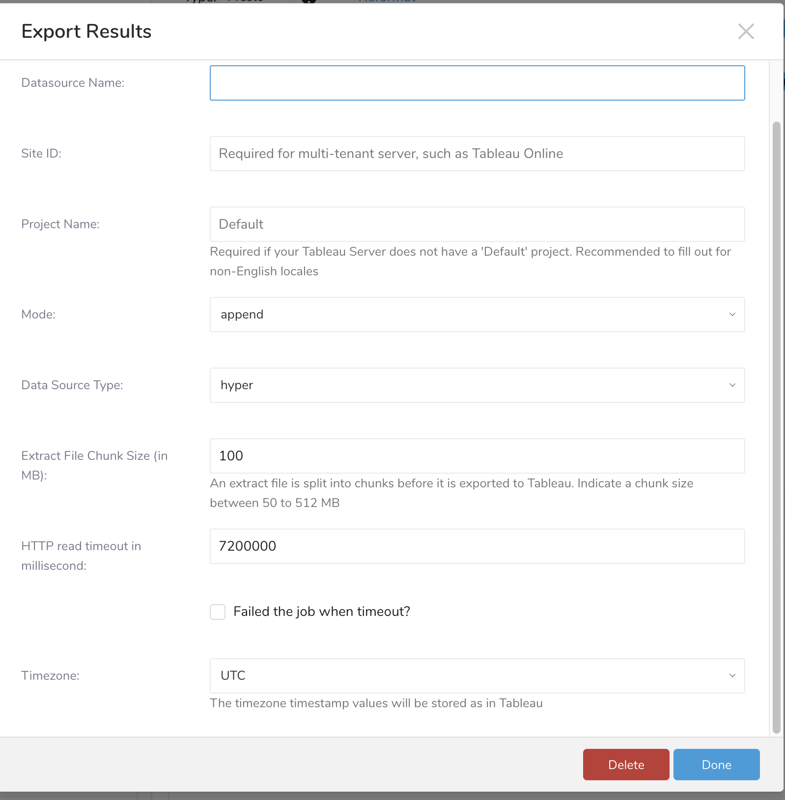 | Extract File Chunk Size | An extract file is split into chunks before it is exported to Tableau. Indicate a chunk size between 50 to 512 MB Chunk file size (in MB) to be uploaded each time, default: 200, min: 100, max: 1024 | |