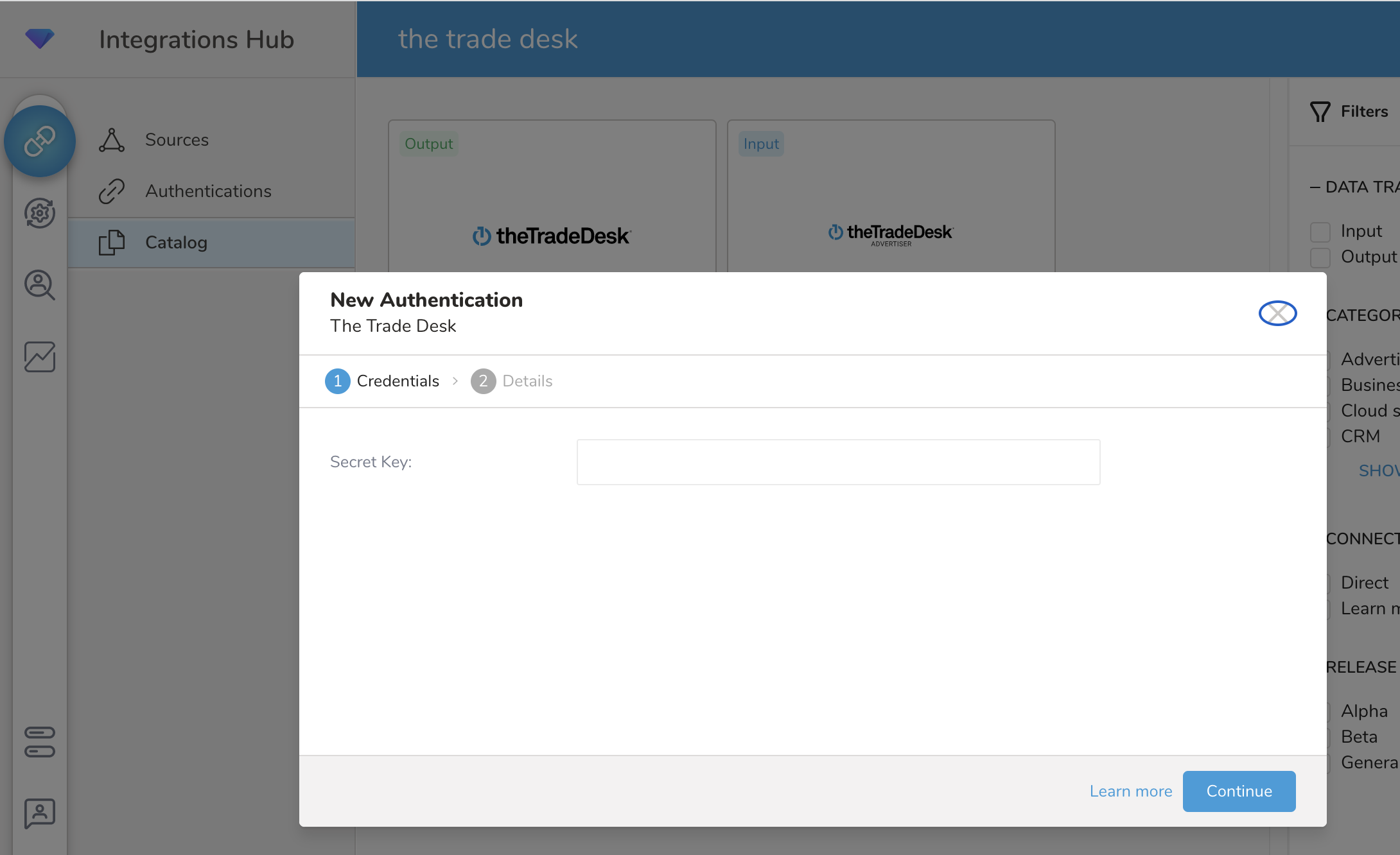 - Edit the secret key you obtained from The Trade Desk, and select Continue.