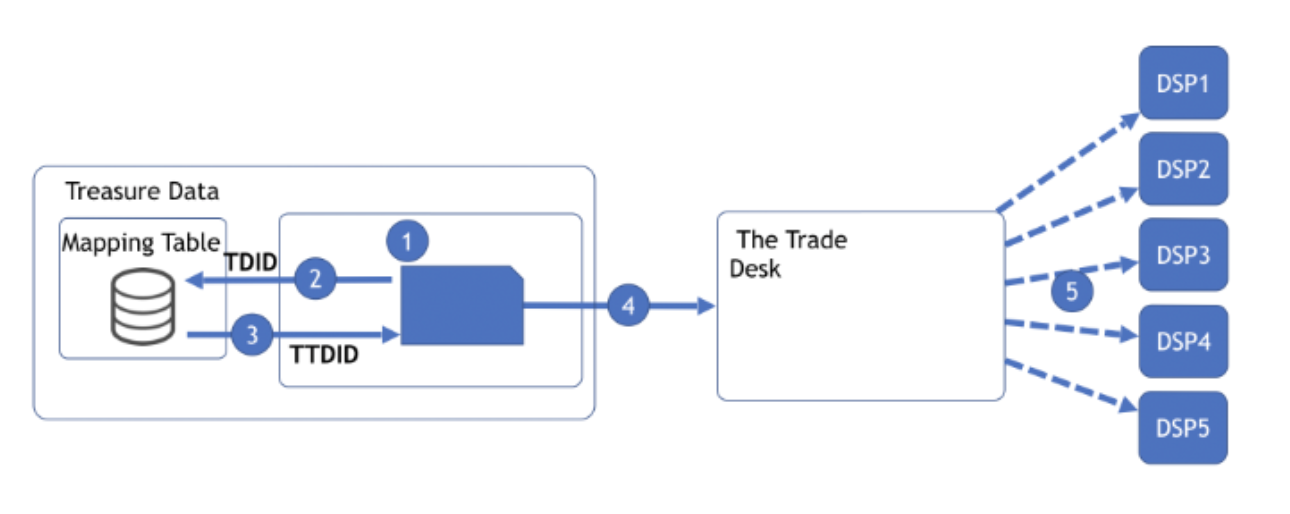 - Cookie-syncing between The Trade Desk DMP and Treasure Data CDP — This is required to create a mapping between The Trade Desk DMP ID and Treasure Data's ID td_global_id.