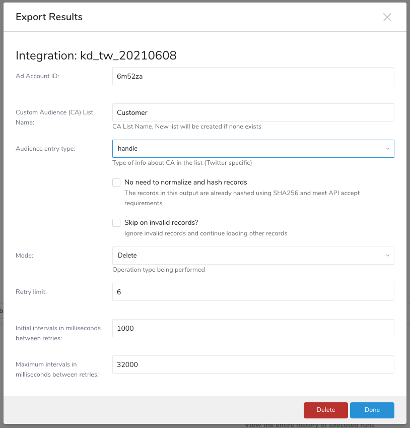 - Delete: Delete users with identifiers that are exported by this feature from the destination Audience