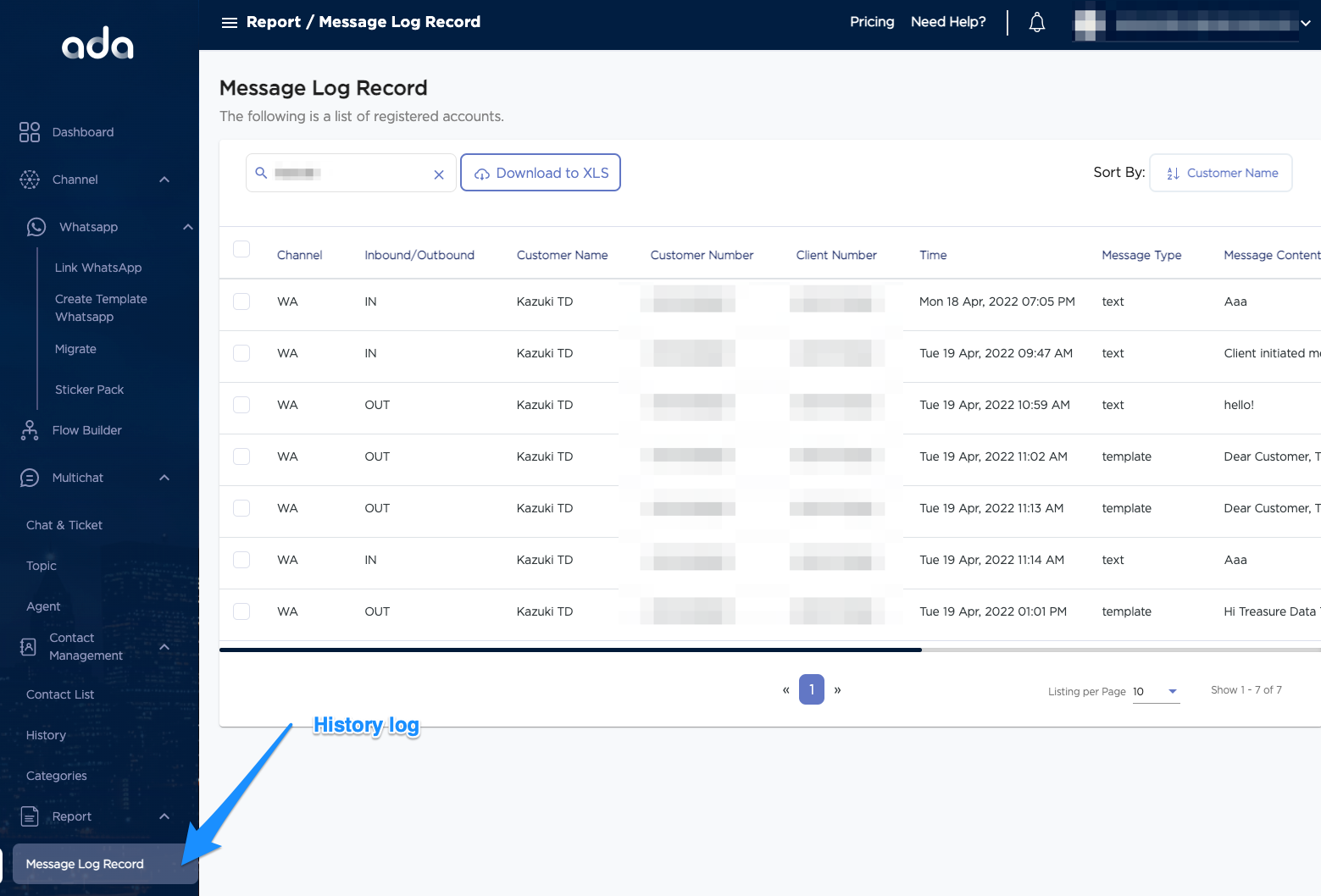 On the ADA Business Console, a log can be found on the Report > Message Log Record page. You may download the log data to your local environment, and then upload it to Treasure Data to enrich your data