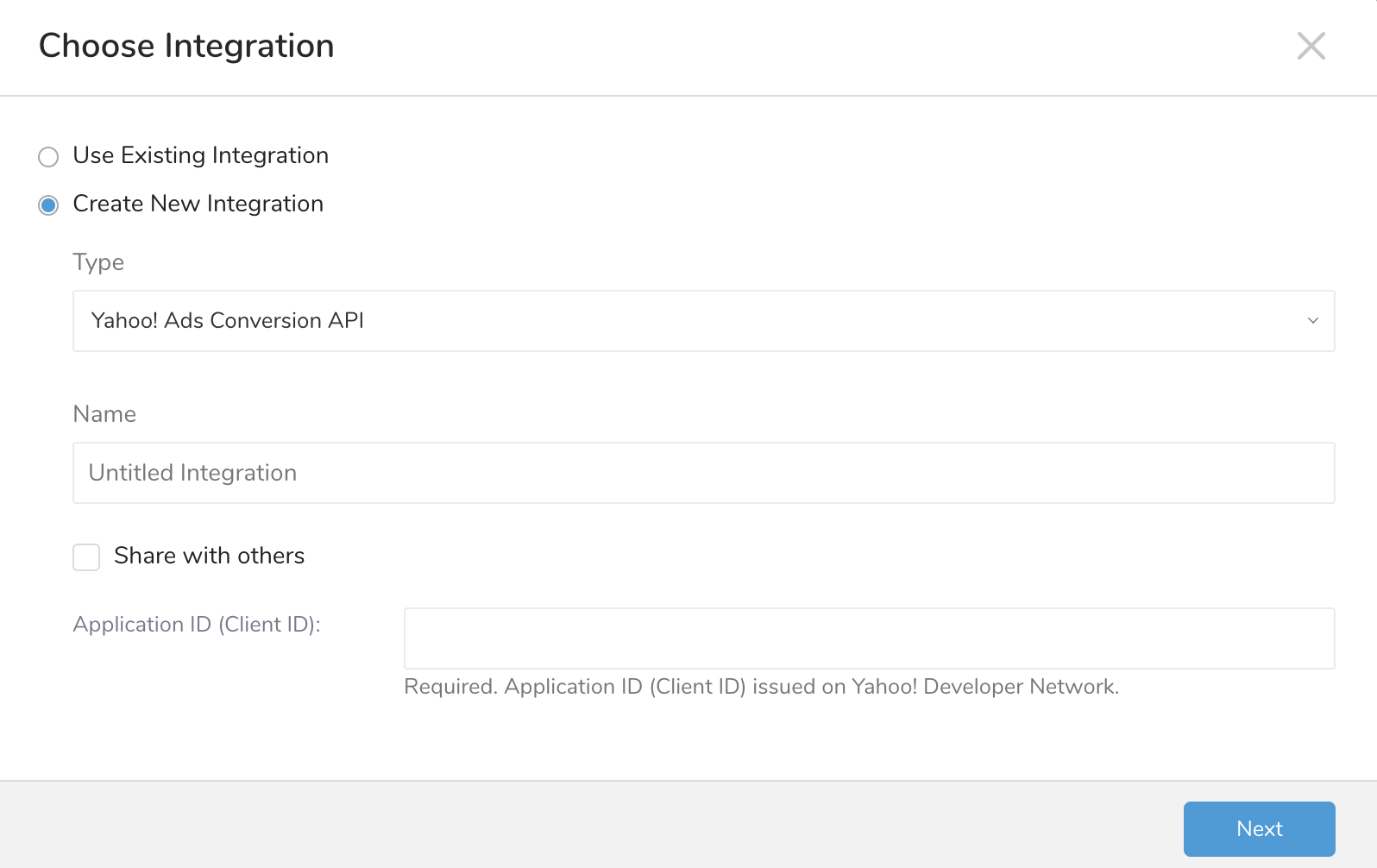 - (Optional) Check Share with others if you want to share this integration with other users.