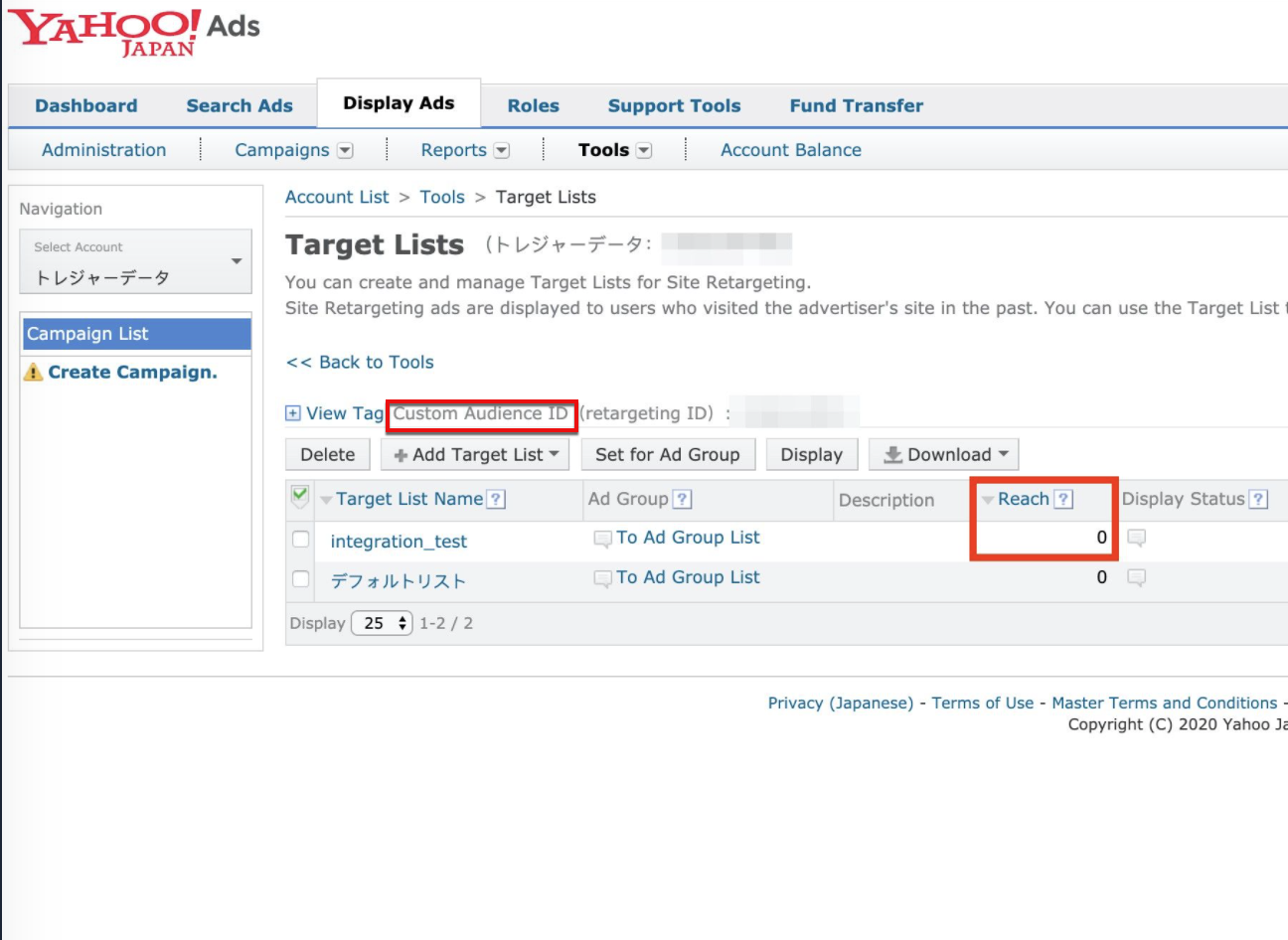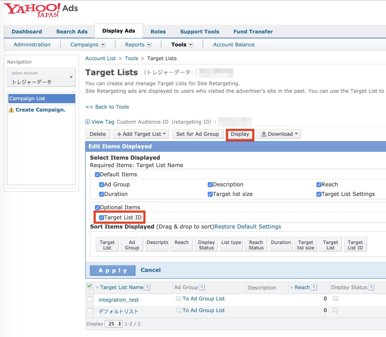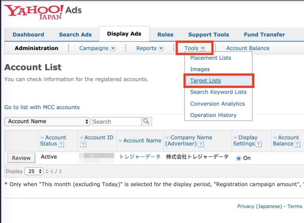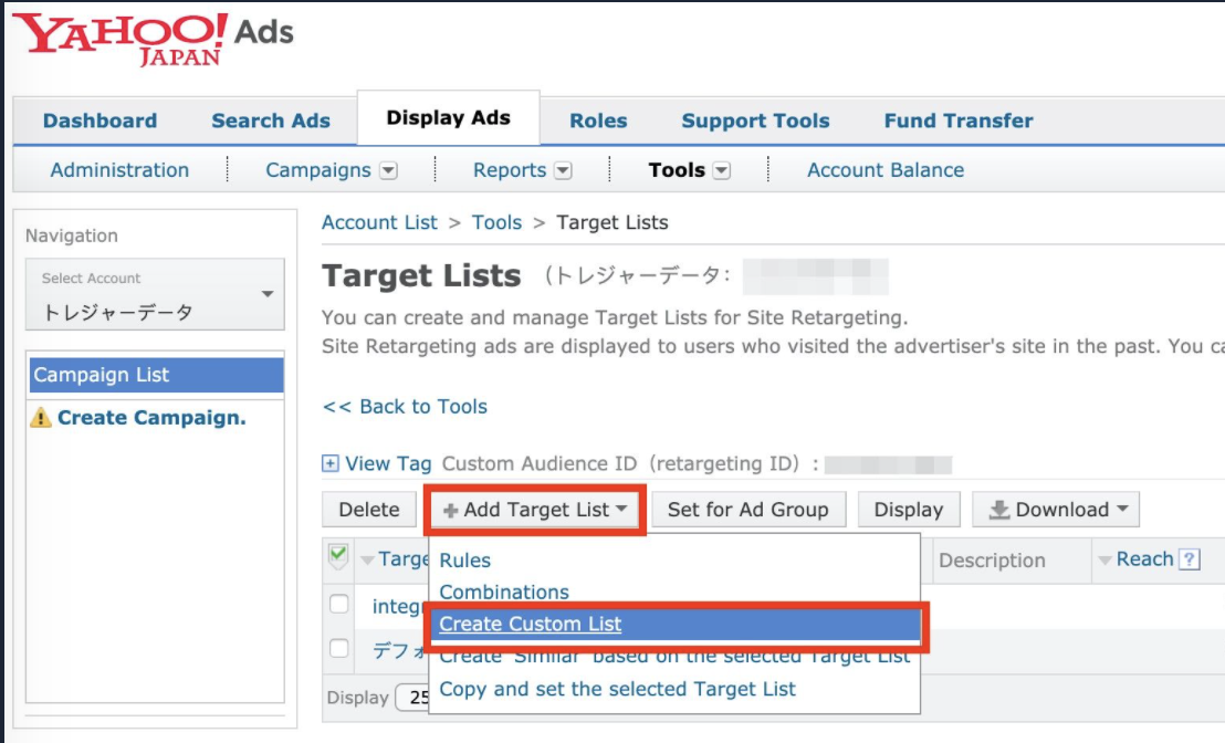 Log into Yahoo! Business Center, select the Tools to the drop-down list in the Display Ads tab, and open the Target Lists page. If you have difficulty navigating the Yahoo! Ads Campaign Management Tool layout, contact the Yahoo! Japan support team.