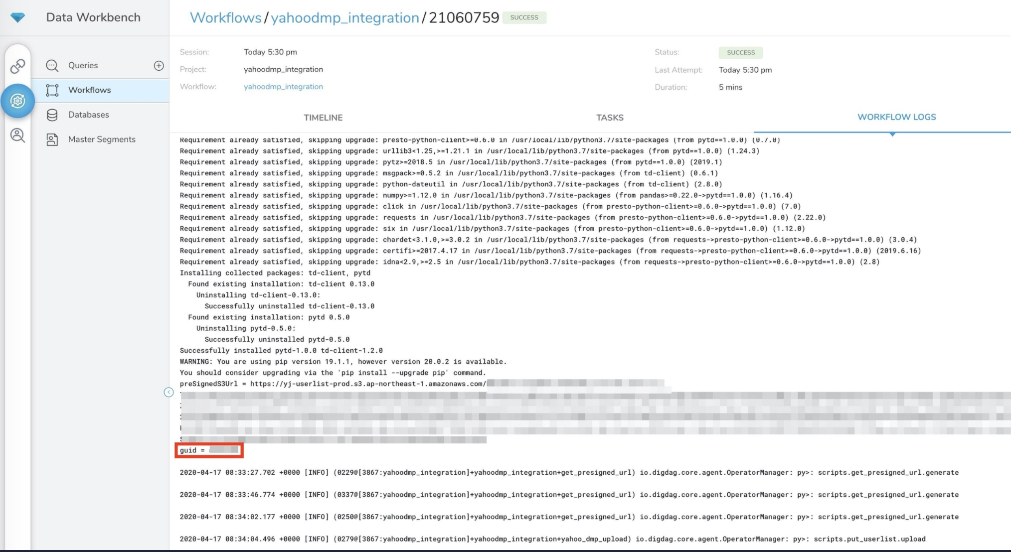 GUIDvalue in the Workflow log for exporting to Yahoo! JAPAN Ads API.