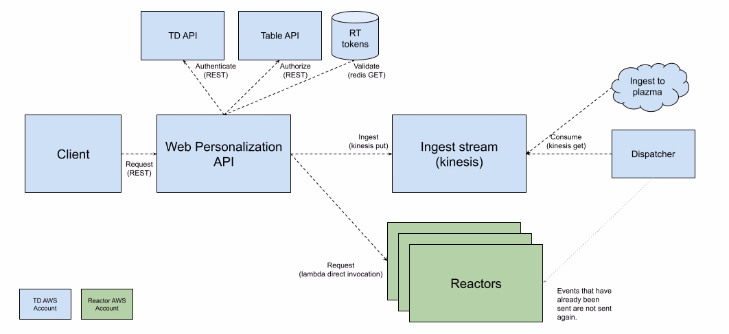 Events configured in the POST body are ingested into Plazma. The Personalization API behaves similarly to the Ingest API. The additional behavior is that real-time tokens are validated and used to route to reactors (the back-end engines for real-time processing). Here is a diagram of the process flow for the API.