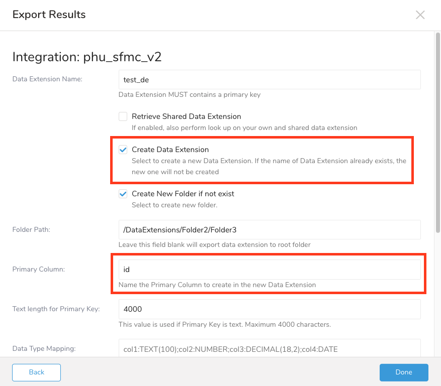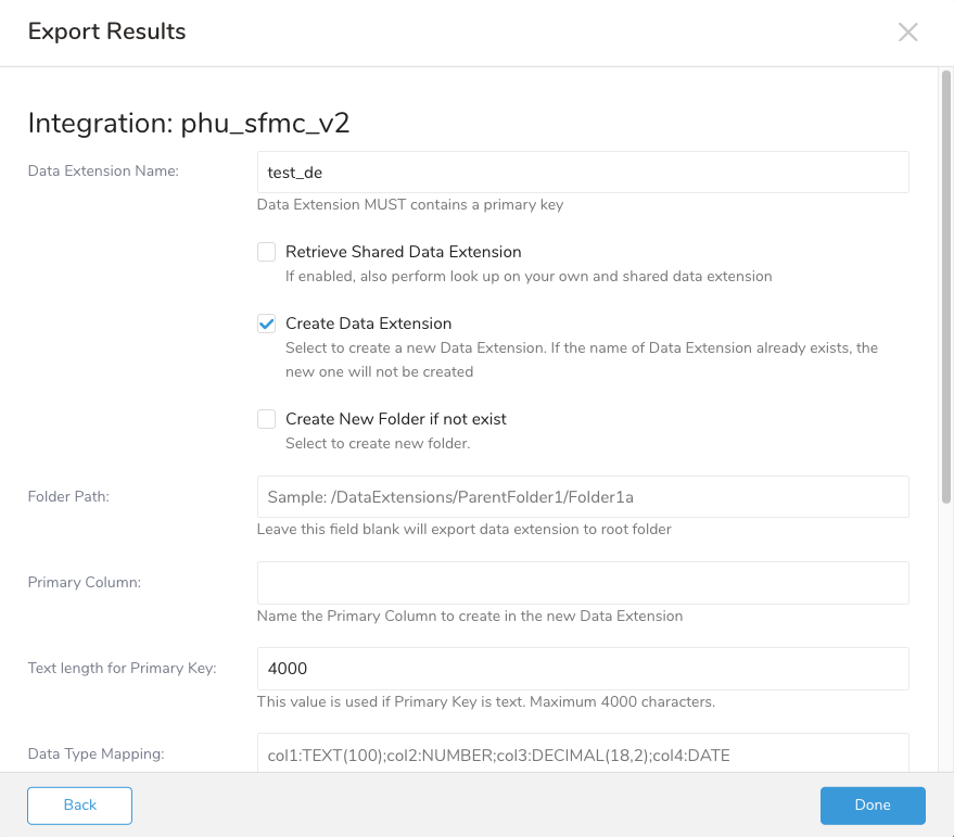 column_options | create_new_de=trueの場合にのみ適用されます。 新しいData Extensionの各列のデータ型を指定します。 サポートされているデータ型: TEXT, NUMBER, DATE, BOOLEAN, EMAILADDRESS, PHONE, DECIMAL, LOCALE, BASE16ENCRYPTED, BASE16ENCRYPTEDEMAIL | string | col1:TEXT(100);col2:NUMBER;col3:DECIMAL(18,2);col4:DATE |