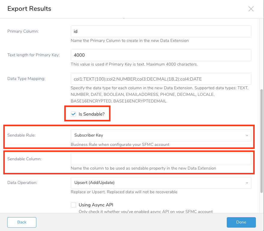 - 既存のData Extension Nameを使用していて、非同期APIを使用する場合は、Using Async APIを選択します。同期APIを使用する場合は、ボックスをオフのままにします。