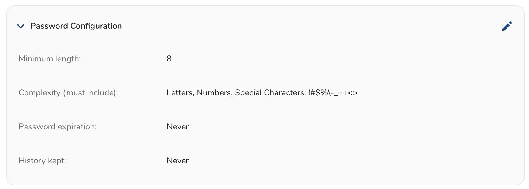 - Password expiration: パスワードの変更を求められるまでの有効期限を設定します。例:なし、30日ごと、1年。