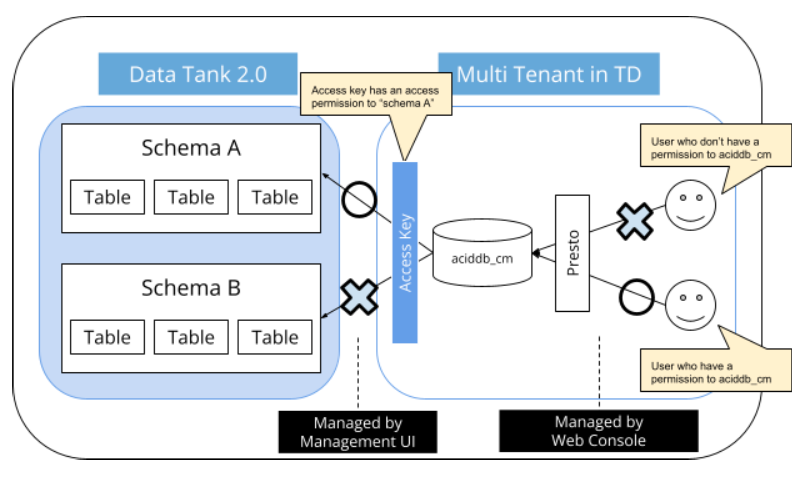 - Data Tank 2.0 Presto Integration requires an access permission to the schema associated with the access key in Data Tank 2.0. Access Control is managed by Management UI.