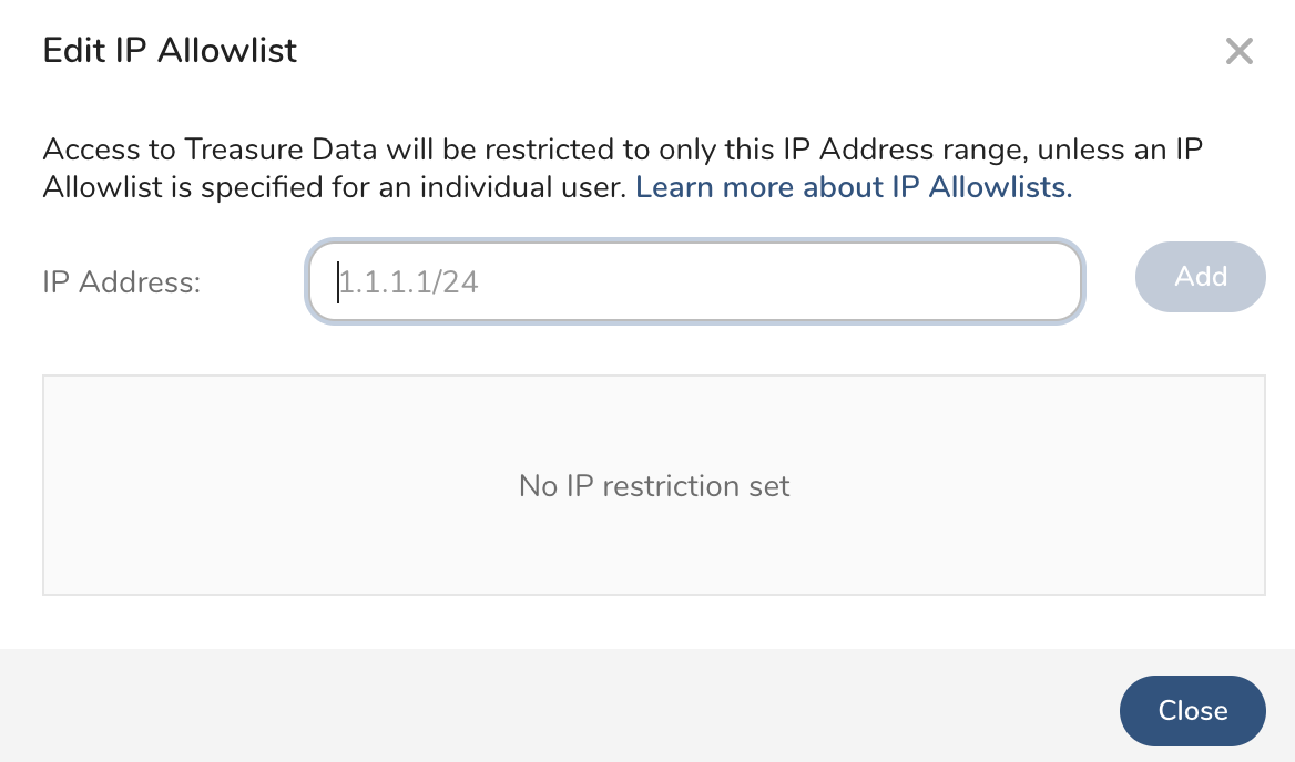 IP allowlists restrict access to Treasure Data accounts through specified sets of IP addresses. There are two types of allowlists: