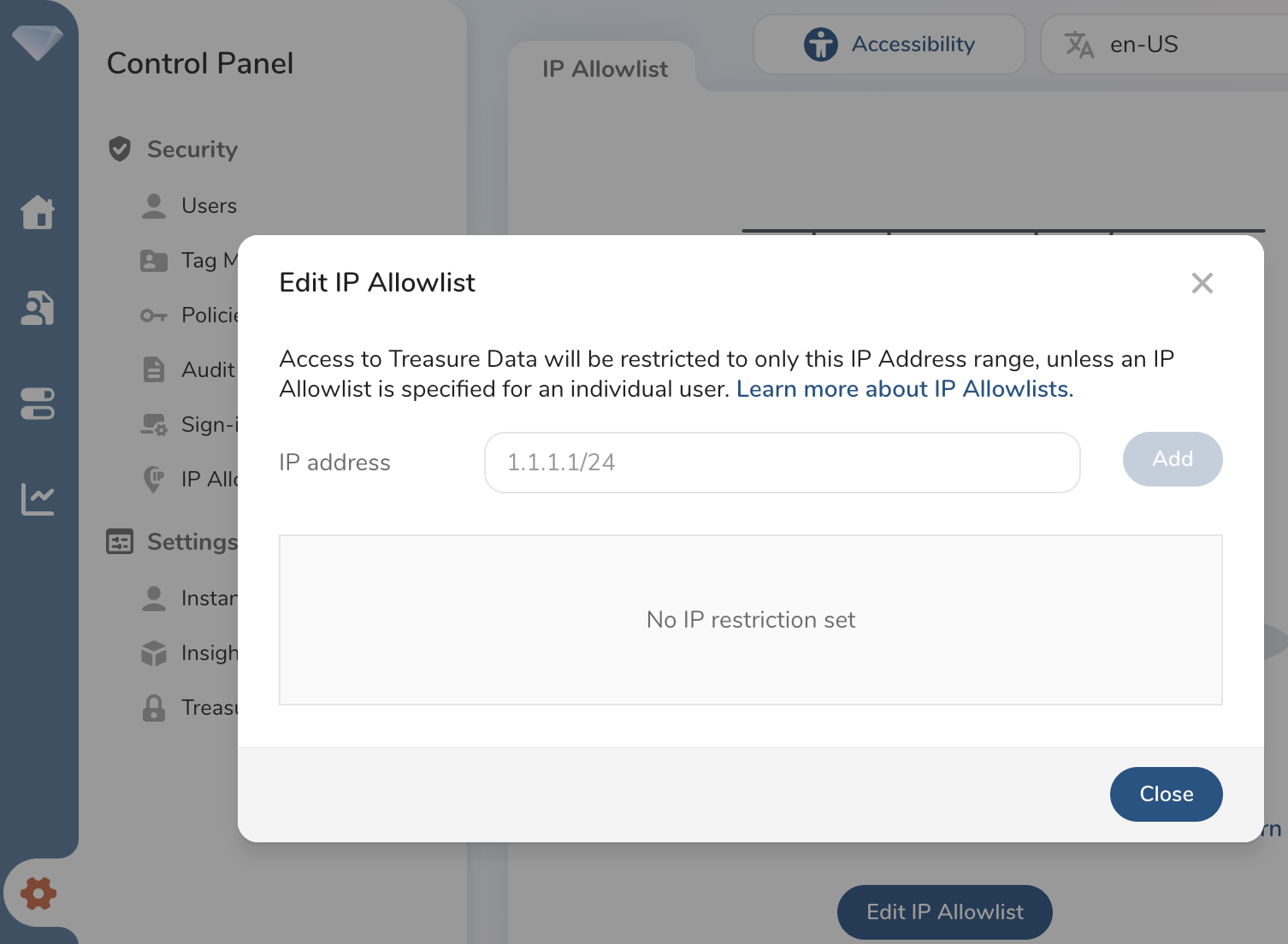 The default account IP allowlists are set from within TD Console. As Account Owner or Administrator, you can create and change the default account IP allowlist.