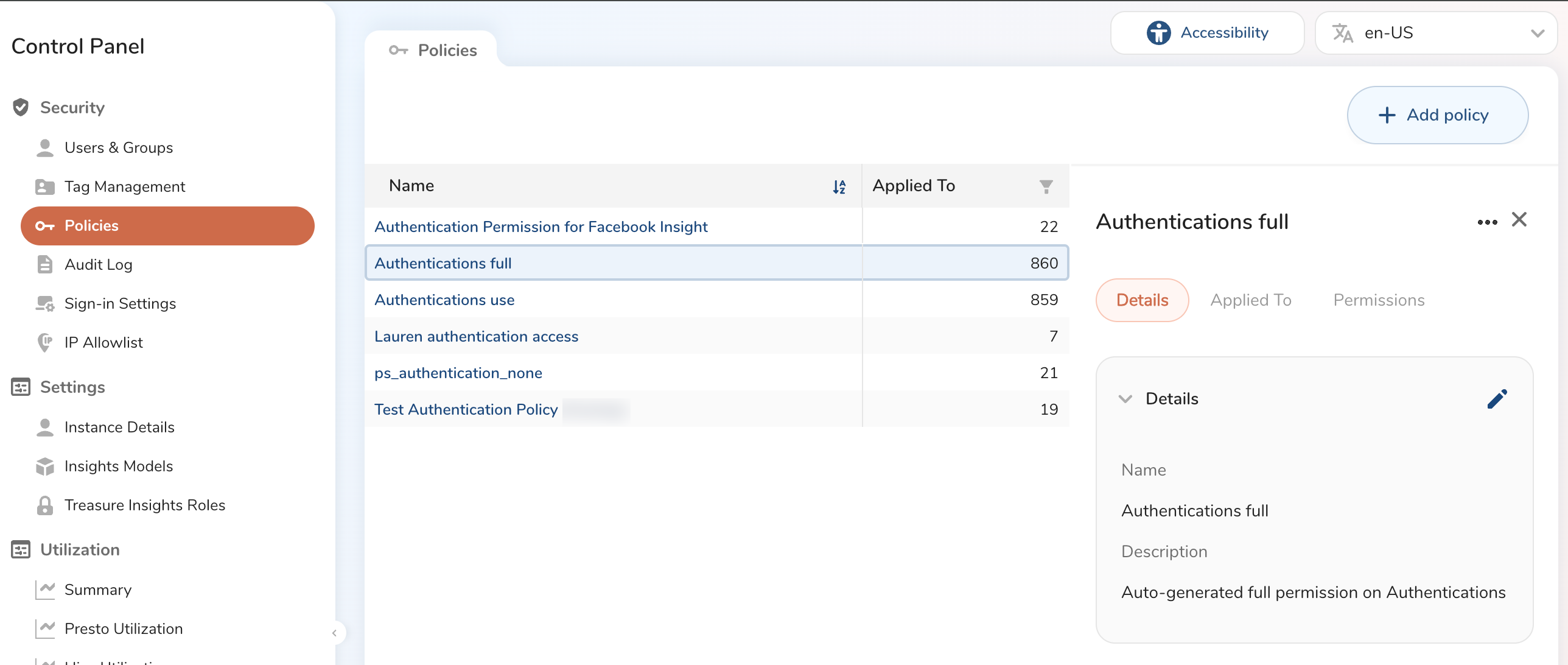 Policies consist of a combination of permissions. You apply policies to your users and can also apply users to policies.