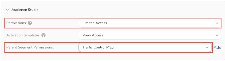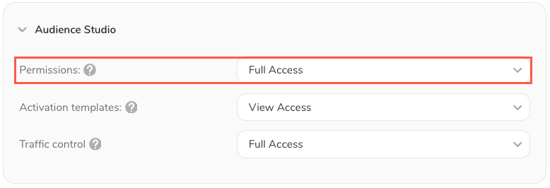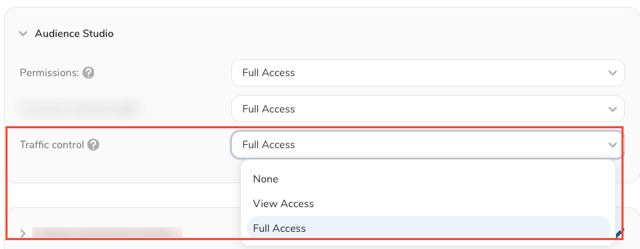 | Full Access | Users can view Audience Studio's features, including profiles, segment folders, predictive scoring, API tokens, and journeys. Full access to Audience Studio permissions is required to enable Traffic Control permissions.![]() |