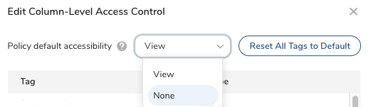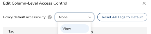 | Policy default accessibility | None (default): The user cannot see the column or query it. View : The user can see the column. Masked : The user can see the column with hashed values and can query it. |