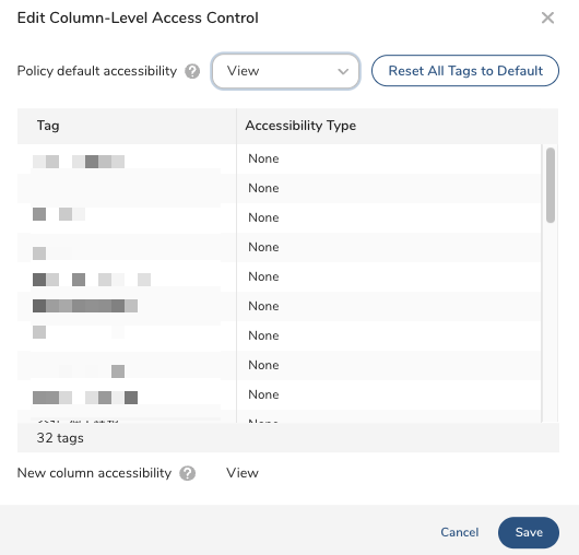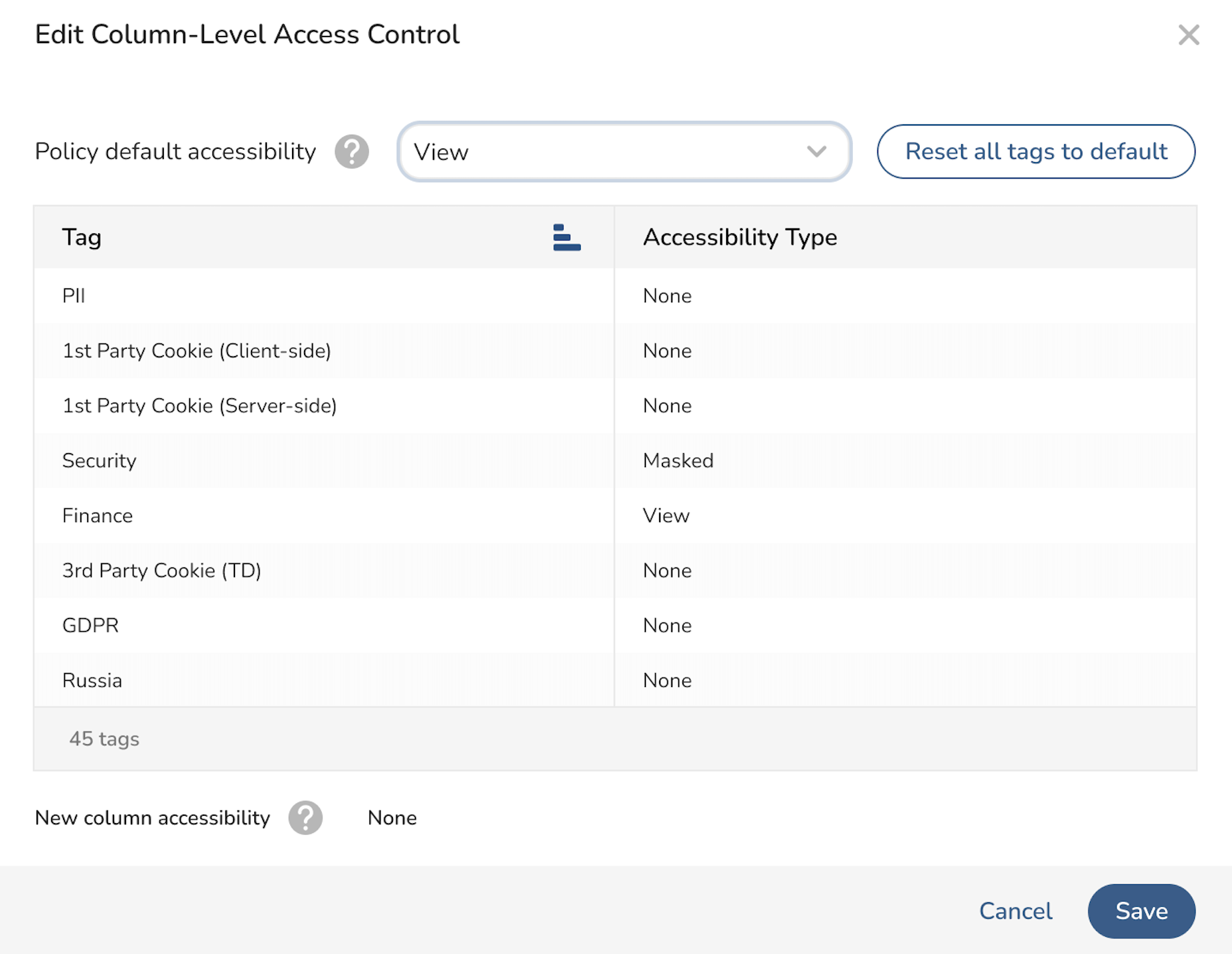 - No Access and Only Allow Access. For example, allow access to columns tagged with Finance , masked columns tagged with Sensitive , No Access to columns tagged with PII.
