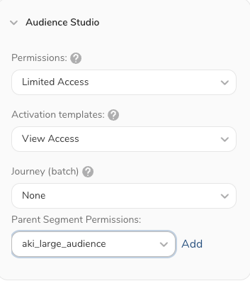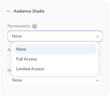 - Audience Studio None permissions: Users will be granted None access to Journey Orchestration.
