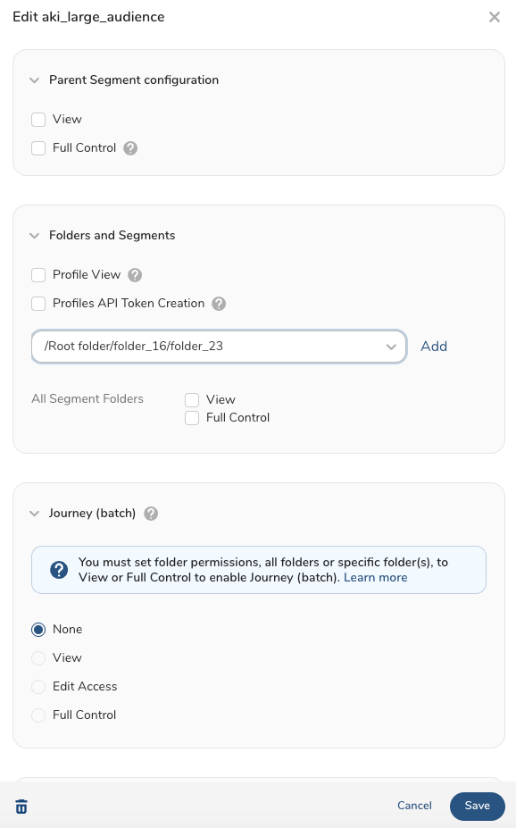 | Limited | No individual parent segment selected | not applicable | No access to batch journeys. |