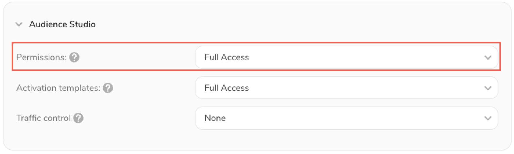 | Full access | Users can view all of Audience Studio's features, including profiles, segment folders, predictive scoring, and API tokens. Traffic Control permissions are displayed. ![]() |