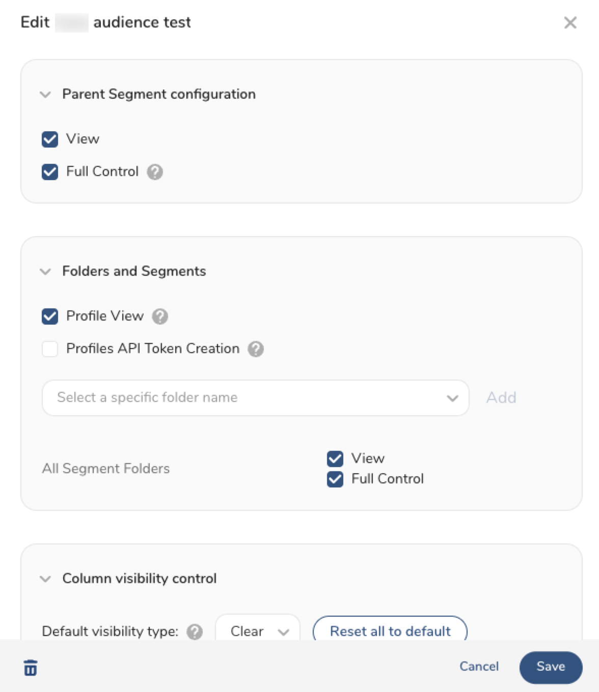 | Specific segment folders | Full Control | Users can view and edit specific segment folders within the specified parent segment. They cannot see profiles unless they have "Profile View" checked. Predictive scoring and API tokens associated with the segments are disabled.![]() |