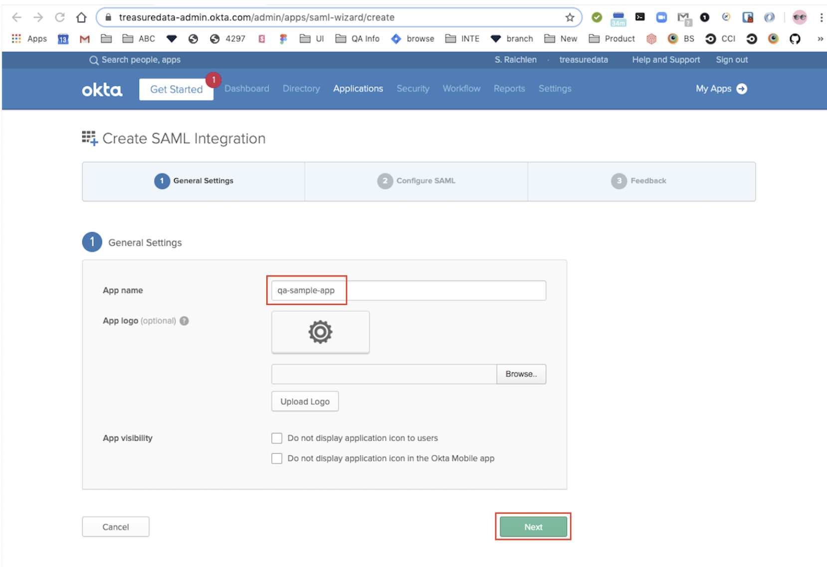 Specify the App name. You can specify any bookmark name, such as Treasure Data SSO. The name you specify is viewable from the Okta dashboard.