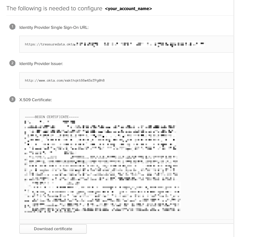 urn:treasuredata:sso:<SITE>:<ACCOUNT_NAME> as your Audience URI (SP Entity ID).