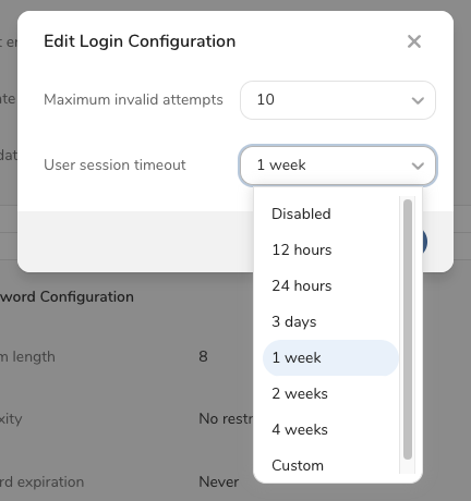The default value is 1 week. For example, if 1 week is specified, a user's session will last 1 week before their session will time-out and require them to re-login. Only administrators can set the maximum session for users.