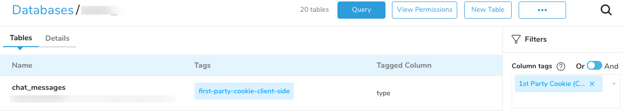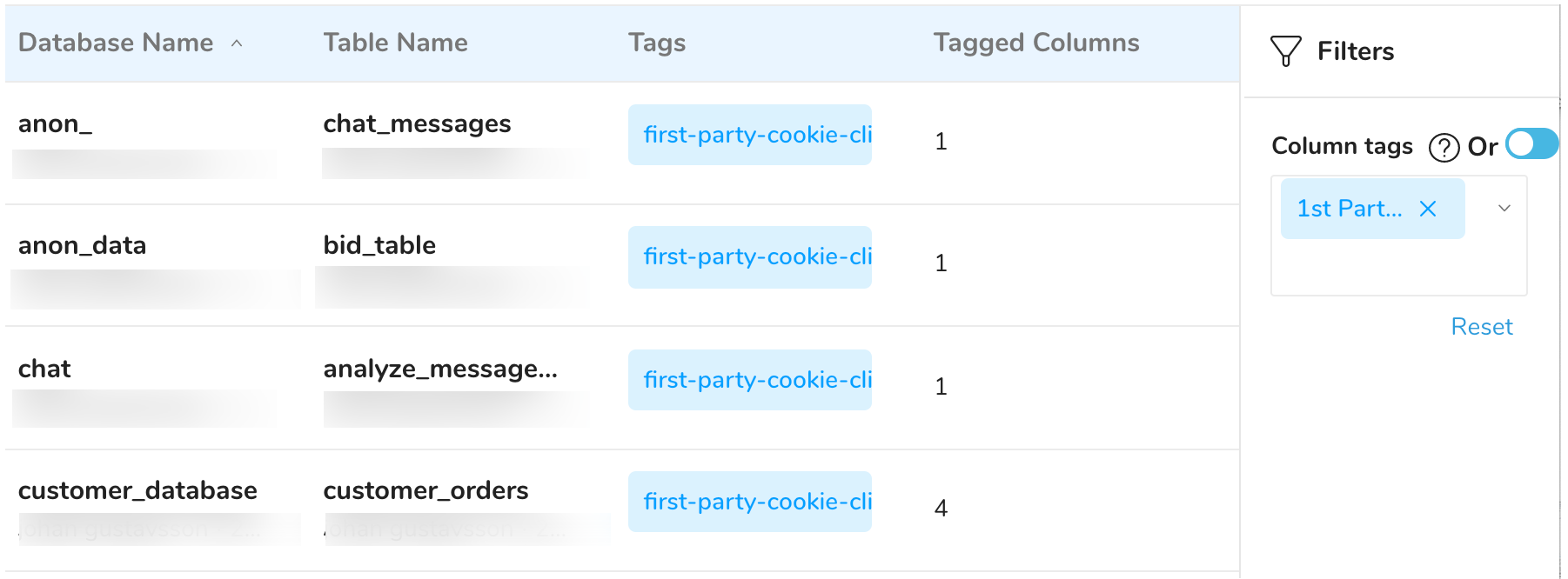 In the previous example, a search for a column tag of 1st Party Cookie - Client-Side results in a display of four databases and the tables that contain the tag. The Tagged Columns indicate how many column tags are used in each table.