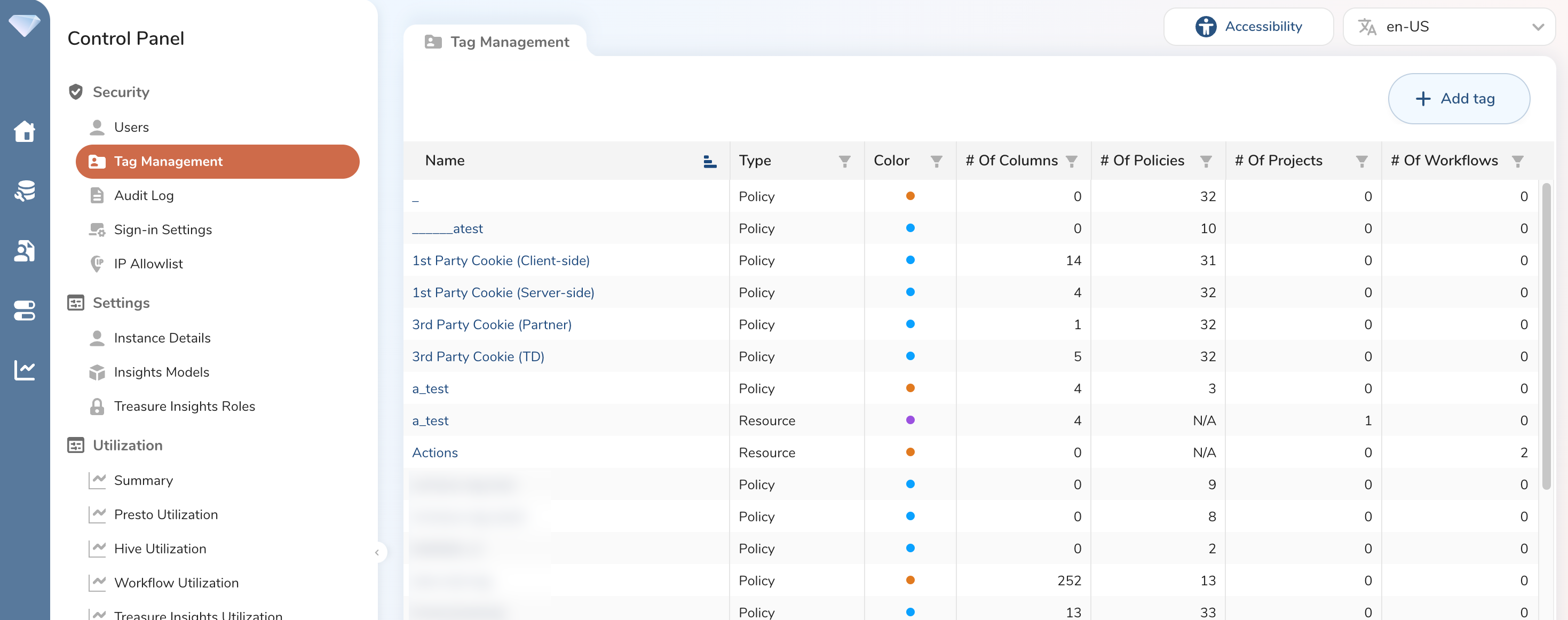 | Column | Sort Ascending/Descending | Search by Tag Name | Filter by Tag | Filter by Color |
