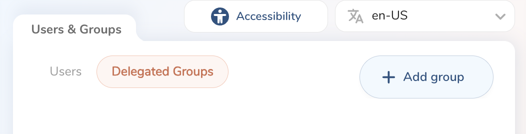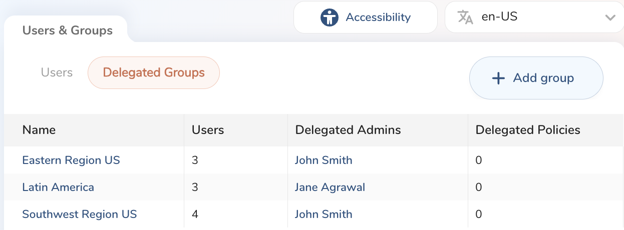 - In the modal that opens, type the name of new Delegated Group and choose a Delegated Admin to oversee the group. Optionally, add a description for your new group and additional users at this time. A delegated group may have more than one delegated admin.
