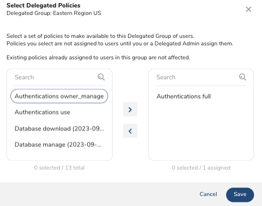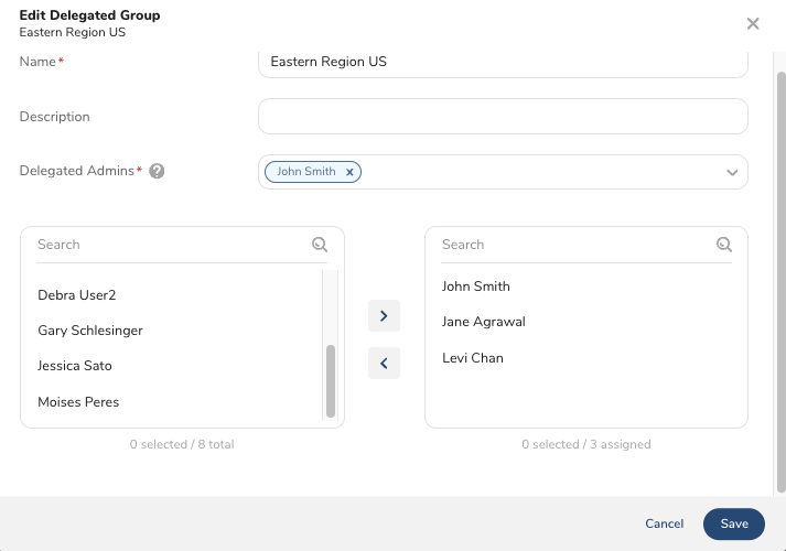 A Delegated Group must have a delegated admin assigned when the group is created. Delegated Admins which are removed from their role remain in the group and must be replaced with a new admin in order to save.