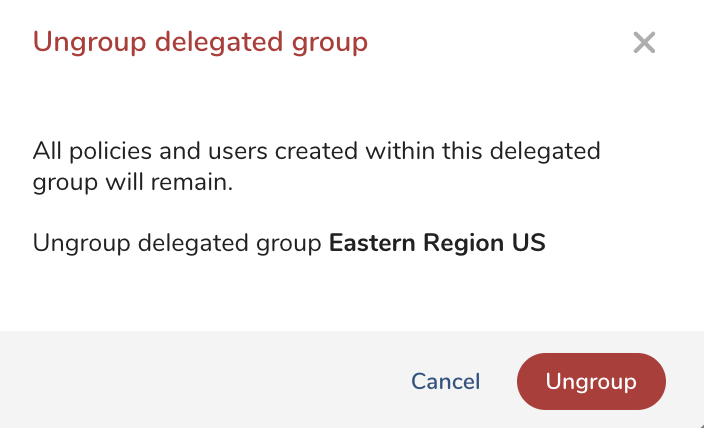 - A dialogue opens confirming you want to ungroup the delegated group. All policies and users created within the delegated group remain. **