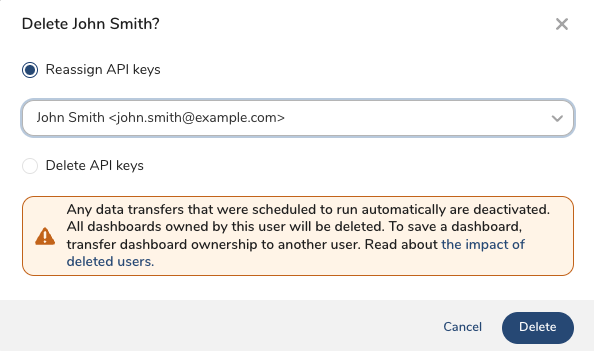 When you delete a user, there can be consequences associated with the deletion. For more information, review Deleted Users and the Impact on Existing Resources.