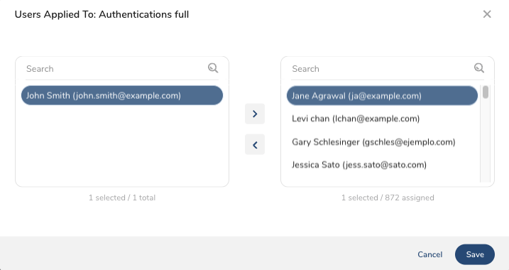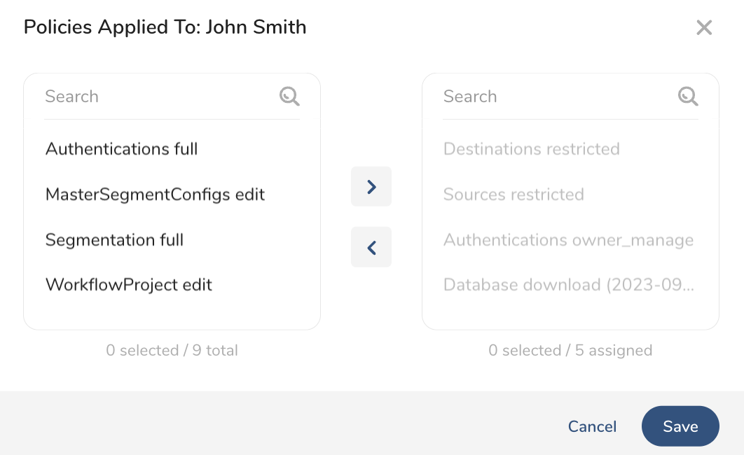 You can assign policies to specific users or assign a user to a policy. Only the policies you've been allowed to grant access to can be selected.