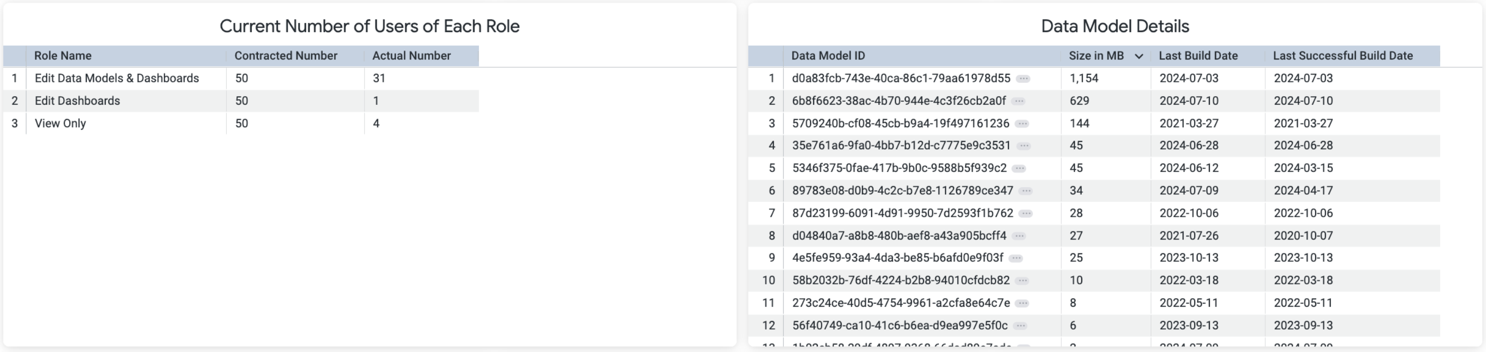 The dashboard provides an overview of user and data model statistics, a detailed count of users and their roles with data model details, and a historical record of usage.