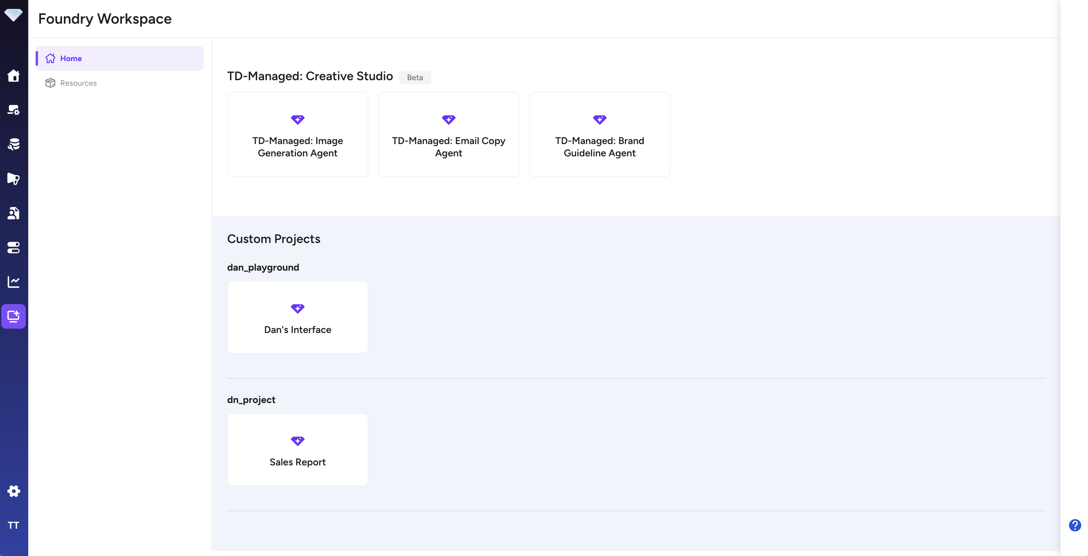 The Treasure Data Foundry Workspace is the general environment where agents that are built in the AI Agent Foundry run. In general, all types of agents that are not associated with a particular application will be able to run in this space.
