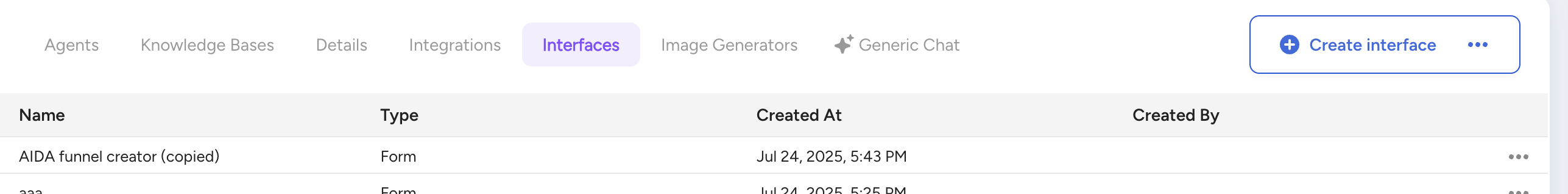 An interface object is the configuration or the screen for agent that will be shown in the Workspace. Once this object is created, underlying agent will be appeared in the Workspace with defined interface. Currently, Interface definition supports only a Form-type.