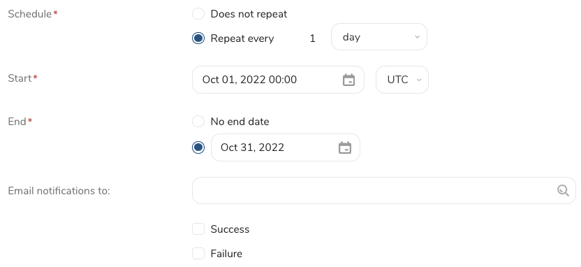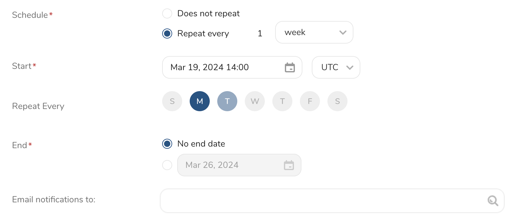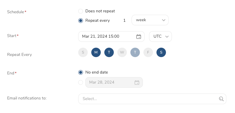 You can select a single day or multiple days of the week (including all seven days) and configure a custom start and end date.