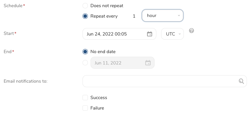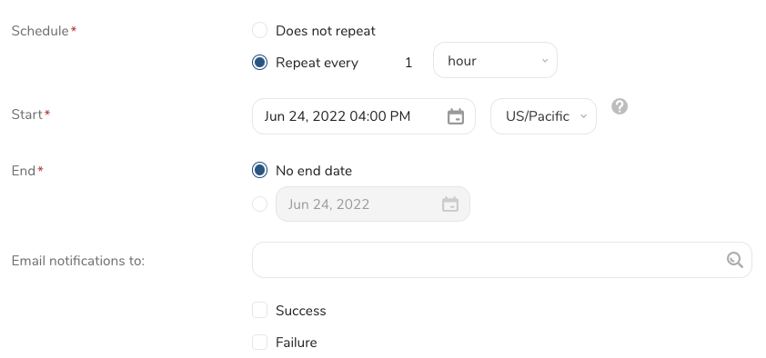 Treasure Data analyzes the time zone and the current time of the user creating the activation. For example, let's assume it's June 24, 2022, at 3:20 PM in the US/Pacific time zone. When you create an hourly activation using the US/Pacific time zone, Treasure Data automatically selects the next available hour to start the activation, 4:00 PM. You can also change the minutes after the hour.