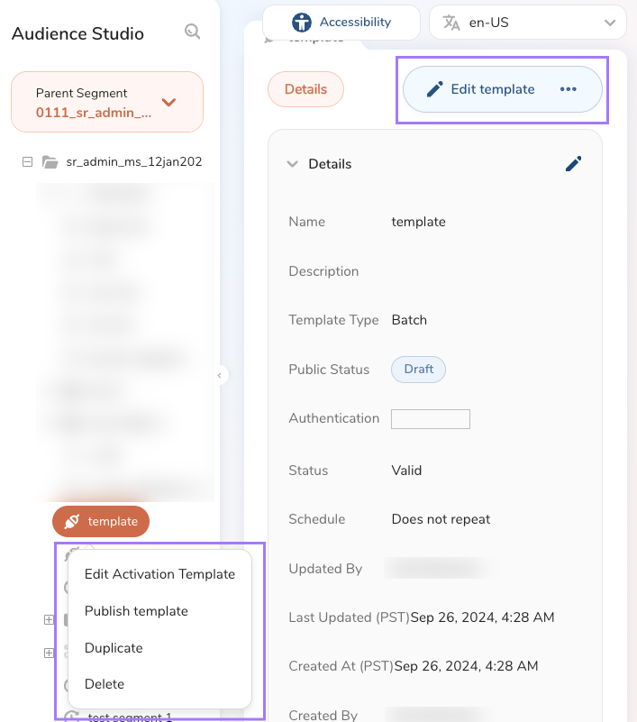 - To edit a batch or batch journey activation template, make the desired changes in the pop-up windows and select Update.