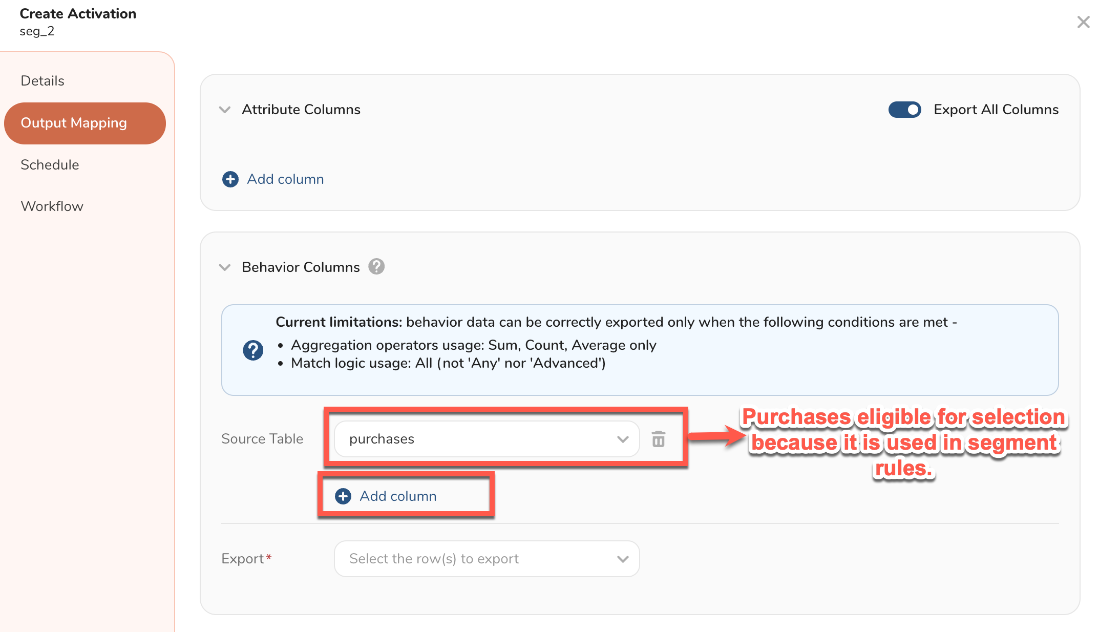- Behaviors are selected based on the criteria provided. Select the rows that you want to export.