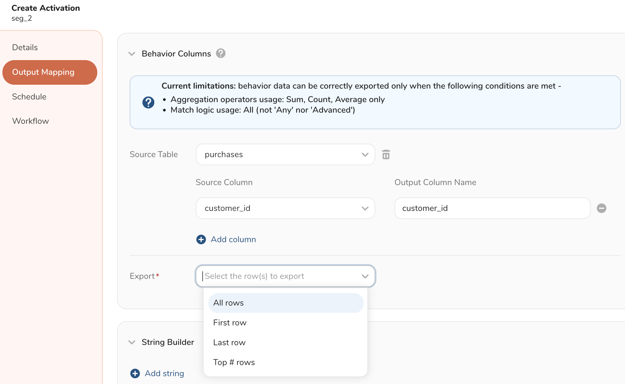 (Optional) You can add columns if needed using String Builder. This allows custom text to be added that can help track or associate activations to specific segments, campaigns, or datetime. For details, see string builder.