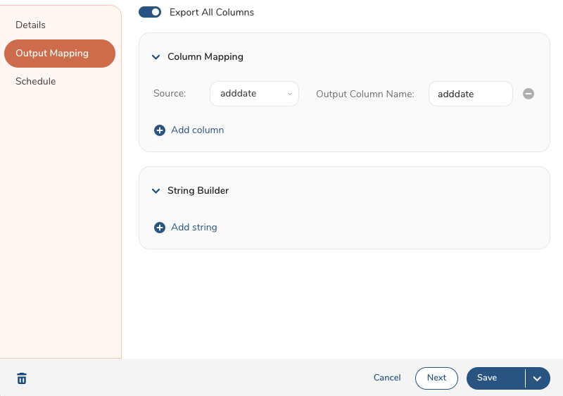 6. Change the activation name. 7. Select Next. 8. Keep the default of Export All Columns, or add columns to column mapping and/or add strings to the String Builder.