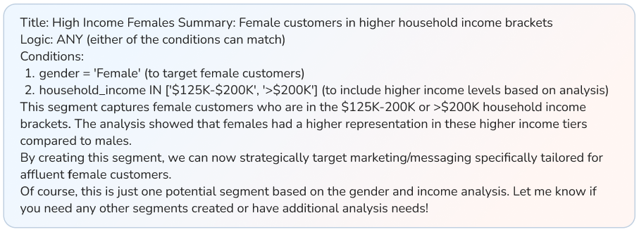 The Audience Agent Agent drills down into the data, giving you information that might be thorough enough to create a segment. If not, the marketers should ask another question!