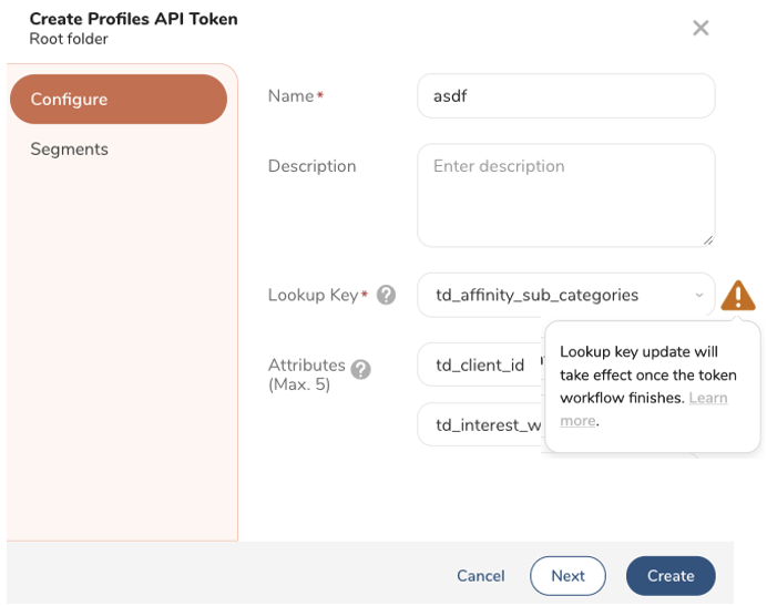 The lookup key update will take effect once the token workflow finishes. When using td_global_id as the lookup key, the Profiles API retrieves the lookup value from the browser cookie instead of the API request's query param. For testing or verification purposes outside of a browser (eg, Postman), use a different column to pass in the lookup value manually.