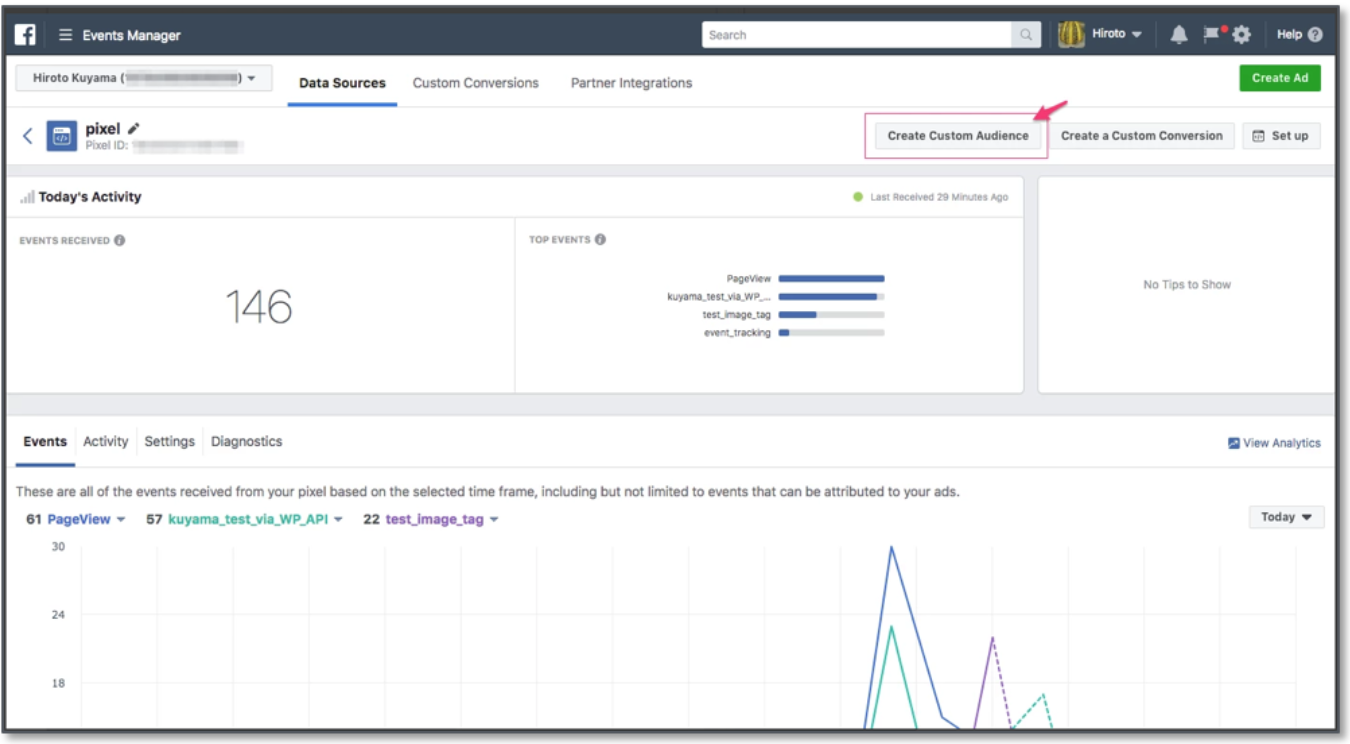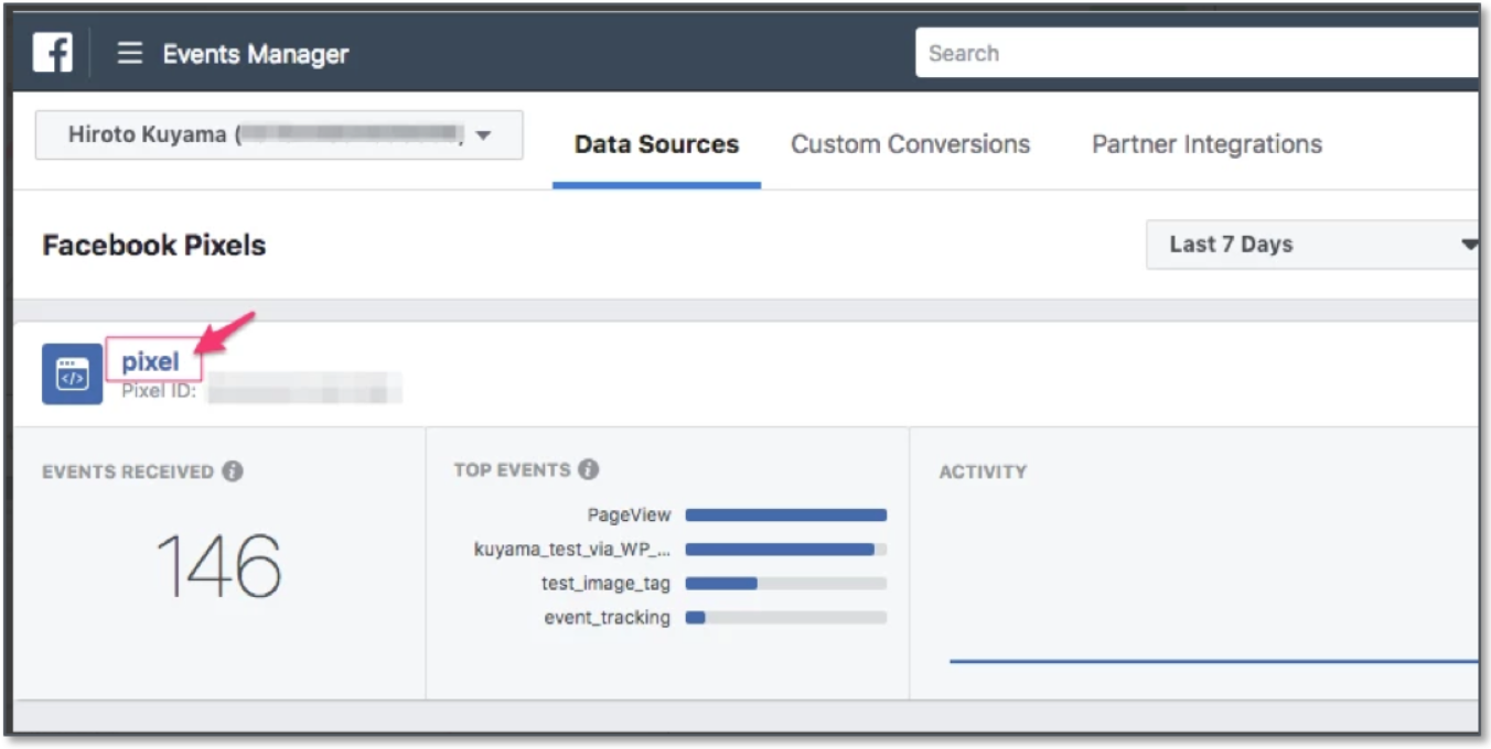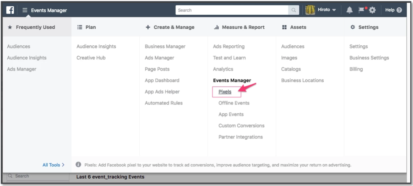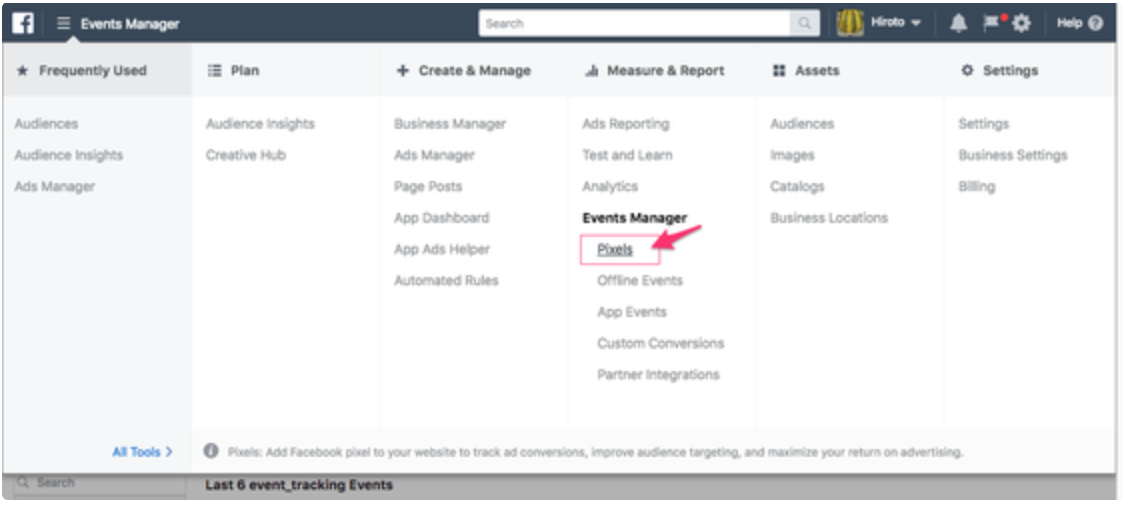 - Go to the Pixels in the Events Manager section.