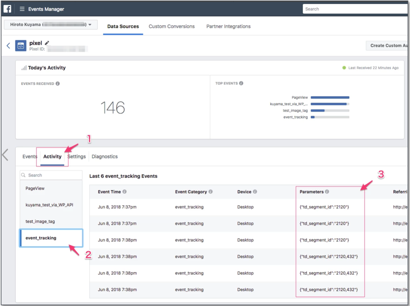 Select the Activity menu and then review the tracking target name you called using the fbq function.