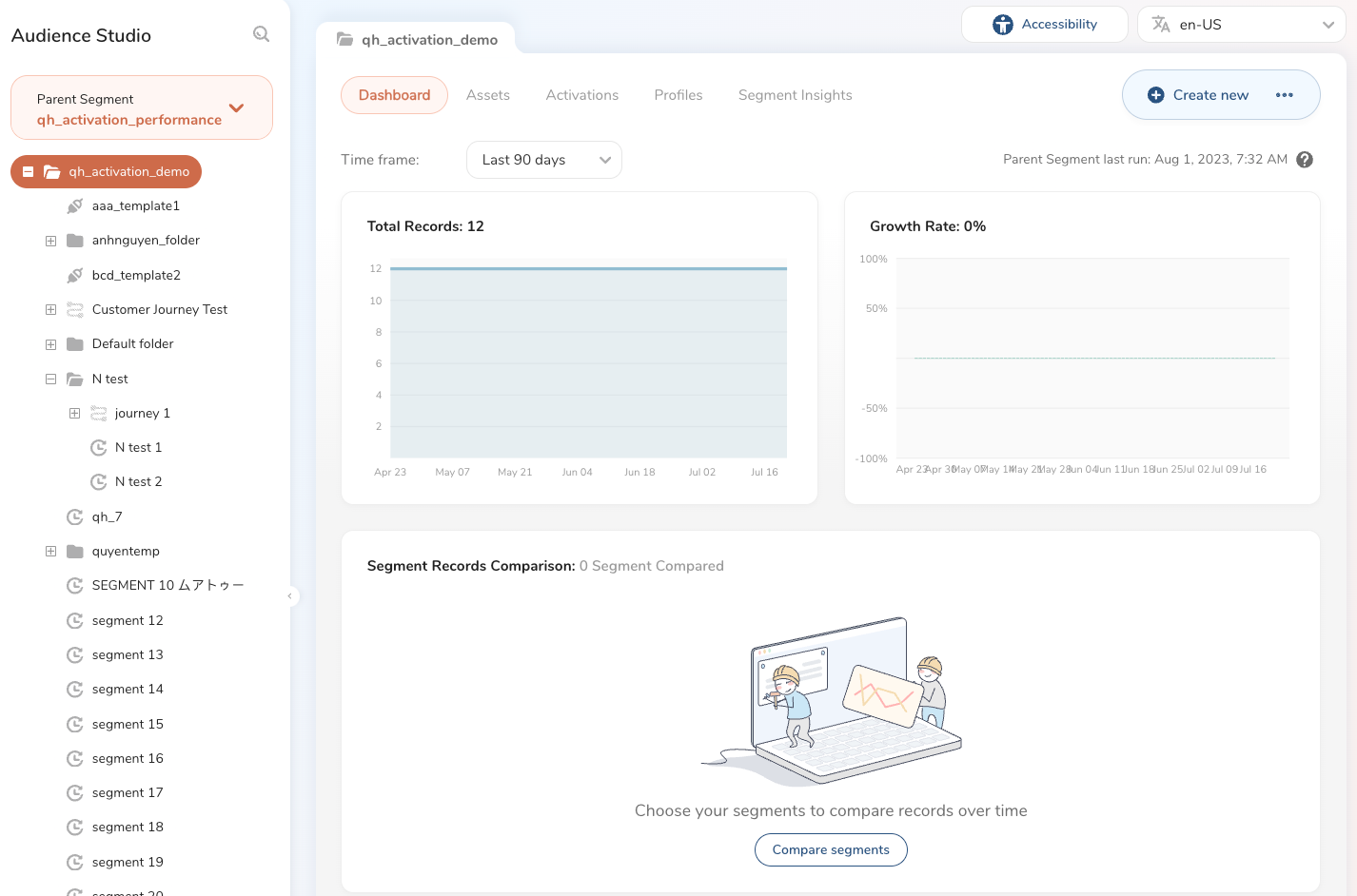 The Folder Dashboard provides a single pane for marketing professionals to quickly analyze total profiles and growth rates and compare segment profiles for a specific folder. Every Parent Segment contains a root folder.