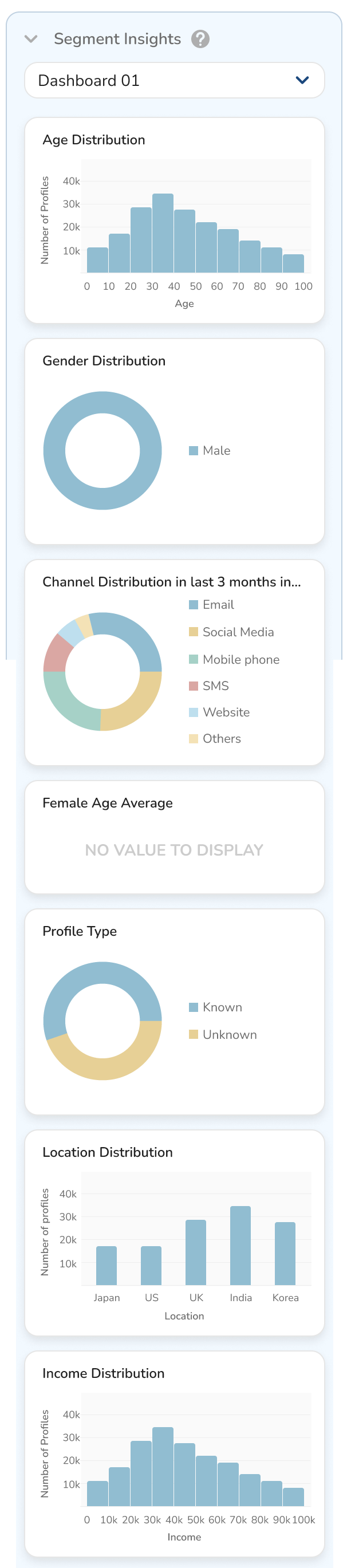Segment Insights Dashboard helps you visualize how specific key attributes affect the size and distribution of a targeted segment. For example, in a segment of 10,000, looking at women in the US vs. women in Japan might show different percentages of women over 40.