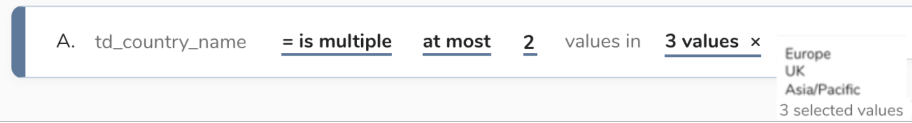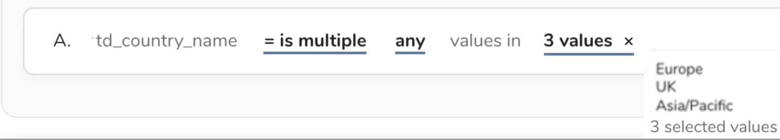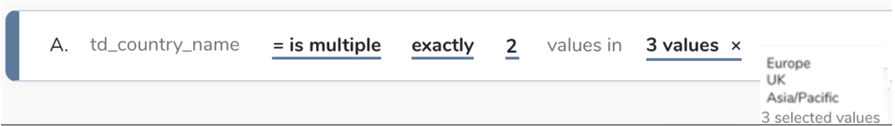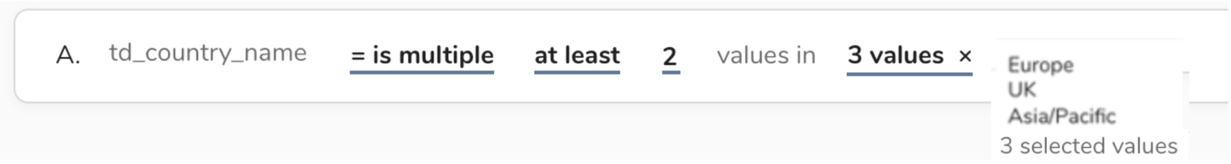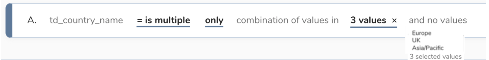When a field is used to record multiple values, it is recorded as an array. Those values can still be individually searchable and selectable. Array operators allow a user to create a rule that selects from those multiple values for a specific profile. The following is a list of array operators.